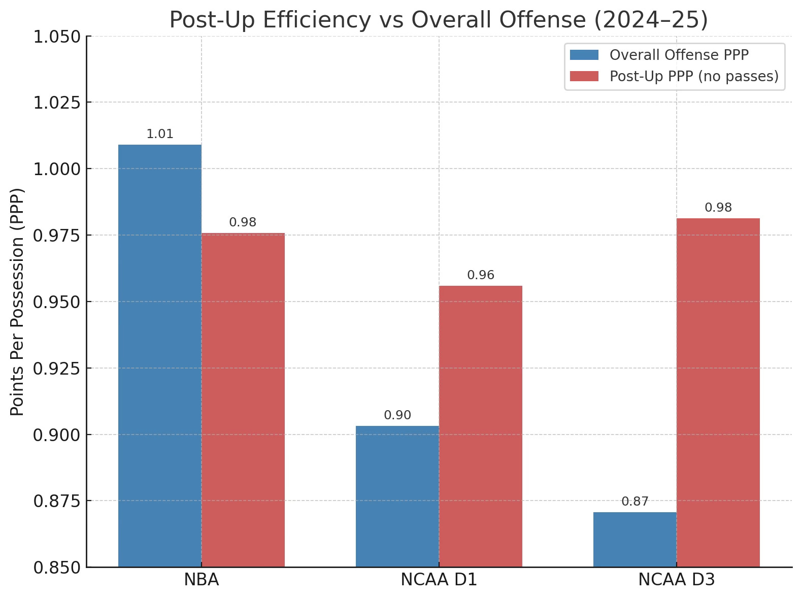 In Division I basketball, post-ups actually become more efficient than the average offensive possession. Drop down to Division III, and the margin grows even larger. In other words, the lower you go, the more dangerous post offense becomes. I’d argue this trend continues in high school and youth basketball, because playing near the basket remains one of the most reliable ways to score.